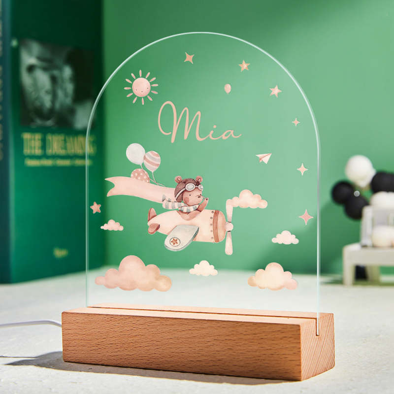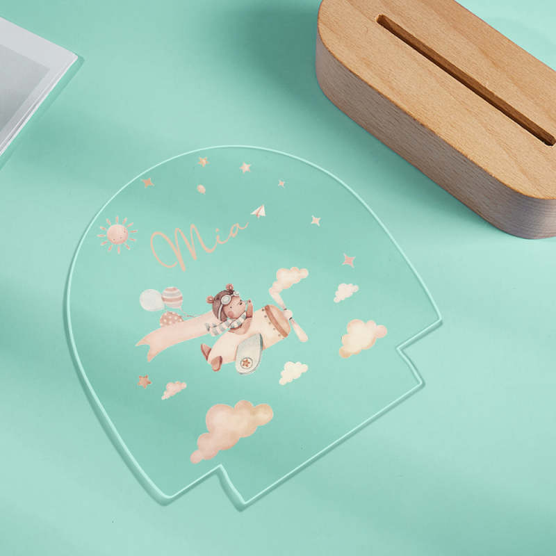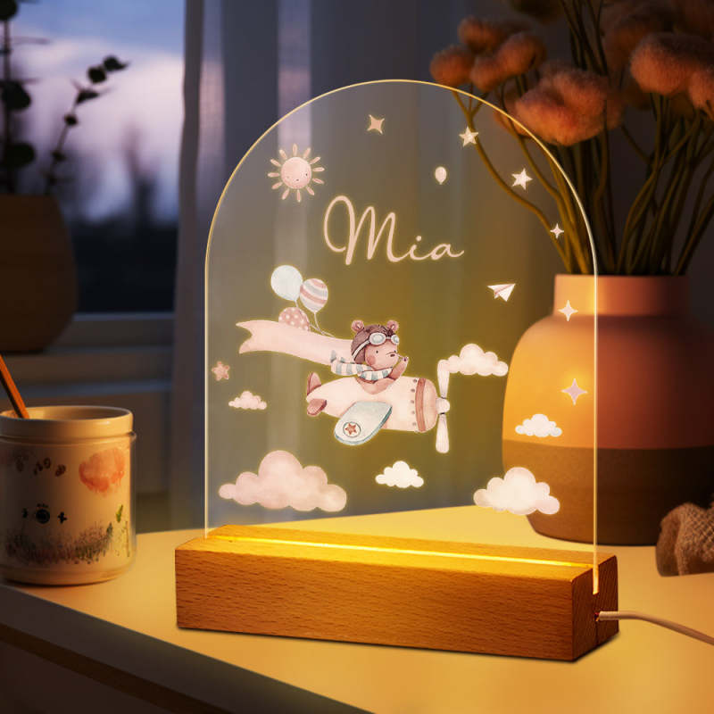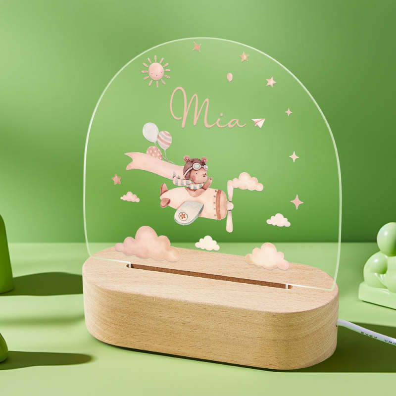 Personalised Baby Night Light With Wooden Base Custom Name Nursery Animals Light Baby Gift